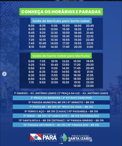 Essa programação favorece quem precisa retornar para Santa Izabel após o horário comercial ou à noite.