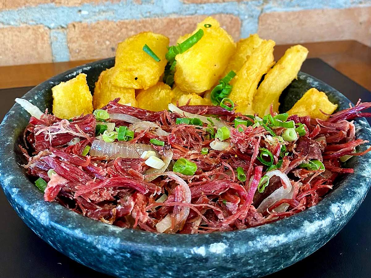 Para acompanhar, a regra é clara: macaxeira bem cozida. Sabe aquela macaxeira que você espeta o garfo e ela se abre sozinha? Pois bem, cozinhe ela apenas com água e uma pitada de sal. Quando servir, coloque a carne por cima da macaxeira quente para que a manteiga de garrafa escorra e tempere a raiz. É uma combinação que não precisa de mais nada, a não ser uma boa companhia para dividir esse banquete digno de rei.