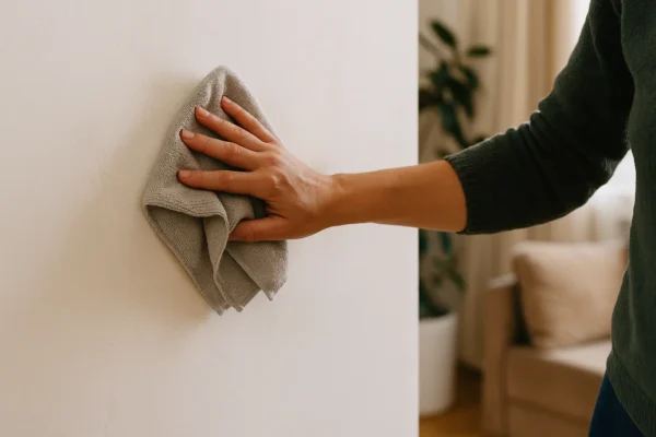 Evite panos encharcados e borrifadores diretamente na parede. O ideal é umedecer o pano ou a esponja e ir fazendo movimentos circulares leves, sempre de baixo para cima, para evitar escorrimentos que possam manchar a pintura.