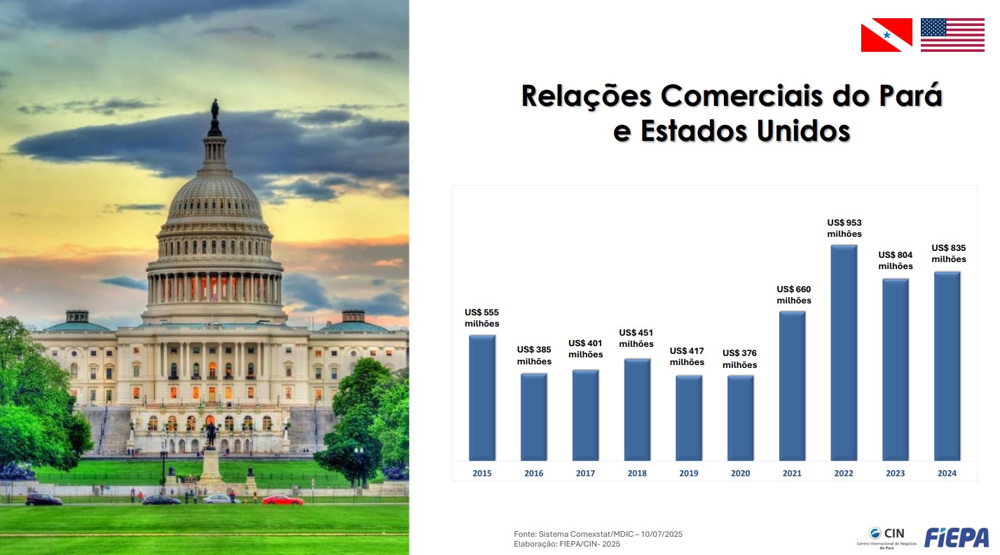 A recente decisão do governo dos Estados Unidos de aplicar uma tarifa de 50% sobre produtos brasileiros gerou forte reação da Federação das Indústrias do Estado do Pará (FIEPA). A entidade avalia que a medida pode afetar diretamente a economia paraense, especialmente diante da importância do comércio com o mercado norte-americano para o setor produtivo estadual.