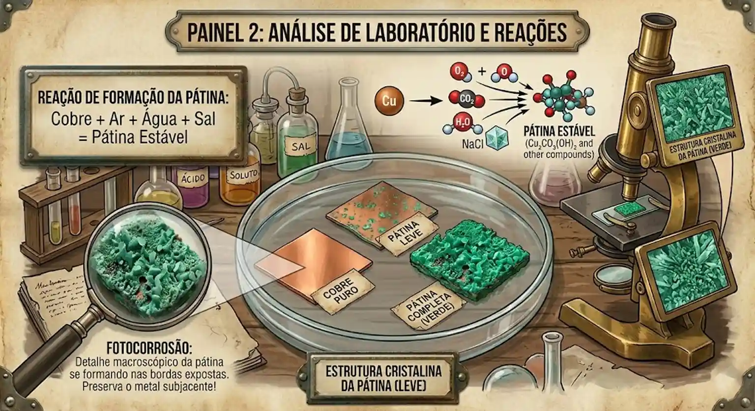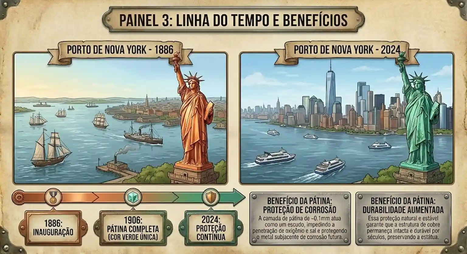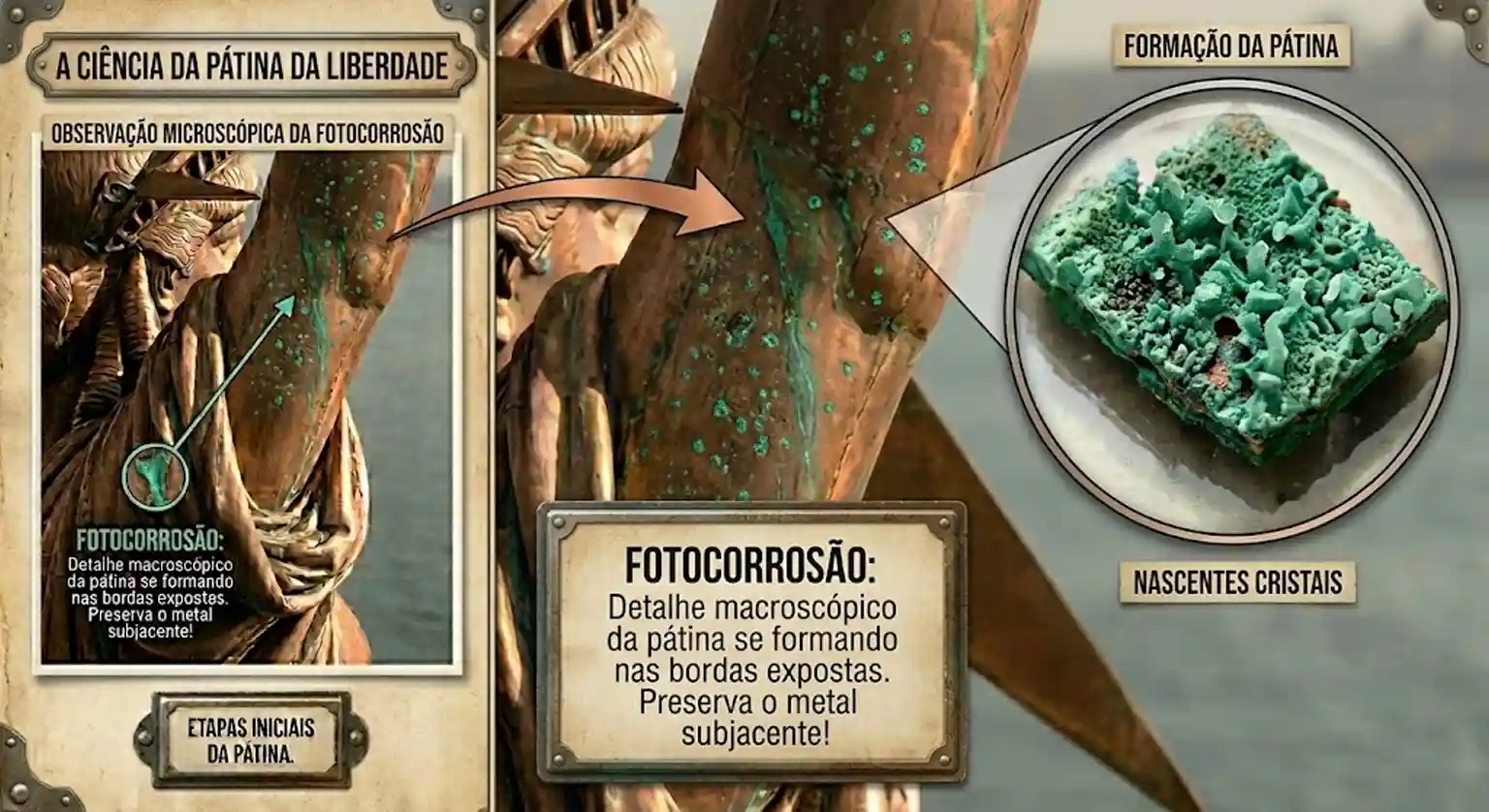 Muitas pessoas confundem esse processo com a ferrugem comum, mas a ciência explica que existe uma diferença fundamental. A ferrugem corrói o metal até que ele perca sua força e desintegre. Já no caso do cobre, o resultado da oxidação é a pátina. Essa camada verde é extremamente resistente e interrompe a corrosão, garantindo que o metal por baixo continue intacto por séculos. Se não fosse por essa cor verde, a estrutura original de cobre provavelmente já teria apresentado furos e desgastes severos.