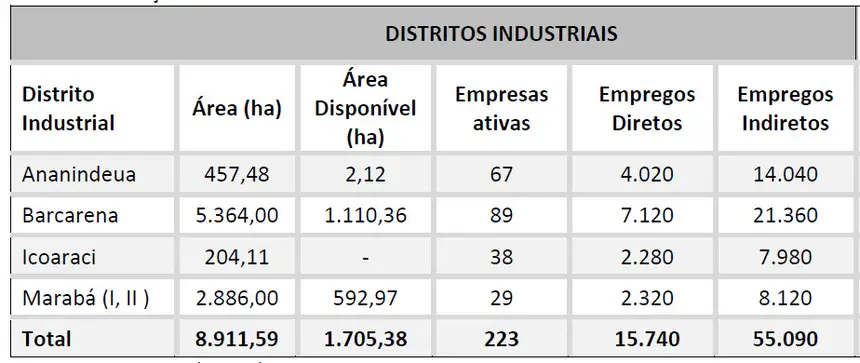 Como resultado, atualmente os Distritos Industriais abrigam negócios de serviços (24%), construção civil (10%), indústrias em geral (8%), logística (7%), alimentos (7%), transformação mineral (6%), materiais de construção (4%), fertilizantes (4%), materiais de construção naval (3%), marcenarias (3%), distribuição (3%), siderurgia (1%), produtos químicos (1%), reciclagem (1%), parque de exposições (1%) e outros segmentos essenciais para o fortalecimento da economia local.