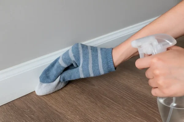 Umedeça a meia: Borrife o produto de limpeza diretamente na meia ou no rodapé. O vinagre com água funciona bem para tirar manchas de poeira, além de desinfetar.