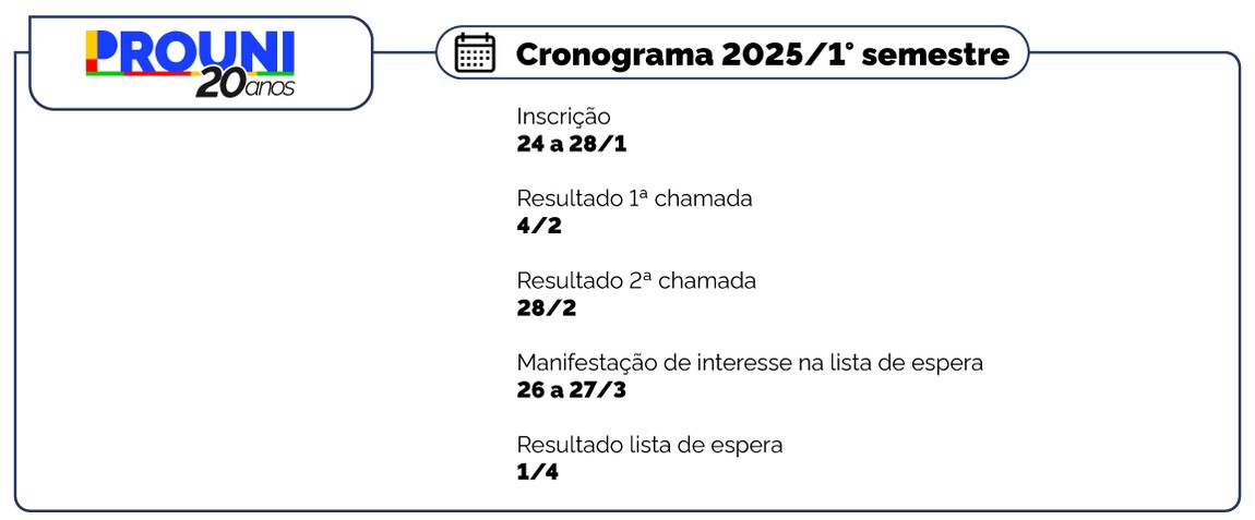 O Ministério da Educação (MEC) publicou nesta quinta-feira, 16 de janeiro, o Edital nº 2/2025 do processo seletivo para o primeiro semestre de 2025 do Programa Universidade para Todos (Prouni). As inscrições são gratuitas e podem ser feitas exclusivamente pela internet, por meio do Portal Único de Acesso ao Ensino Superior, no período de 24 a 28 de janeiro de 2025. O resultado da primeira chamada será divulgado dia 4 de fevereiro na página do Prouni, no portal Acesso Único. Já a segunda chamada sairá no dia 28 fevereiro.