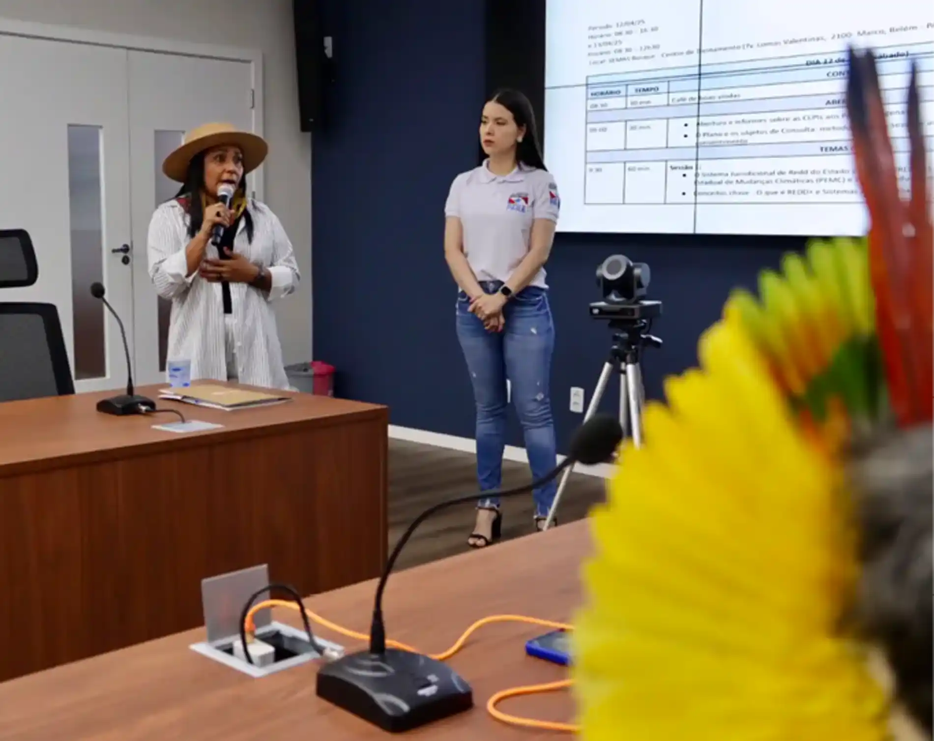 Durante a abertura, a secretária dos Povos Indígenas do Pará, Puyr Tembé, e a secretária adjunta de Gestão de Recursos Hídricos e Clima da Semas, Renata Nobre, destacaram a importância da oficina como ferramenta de participação de representantes dos povos indígenas no debate sobre políticas climáticas.